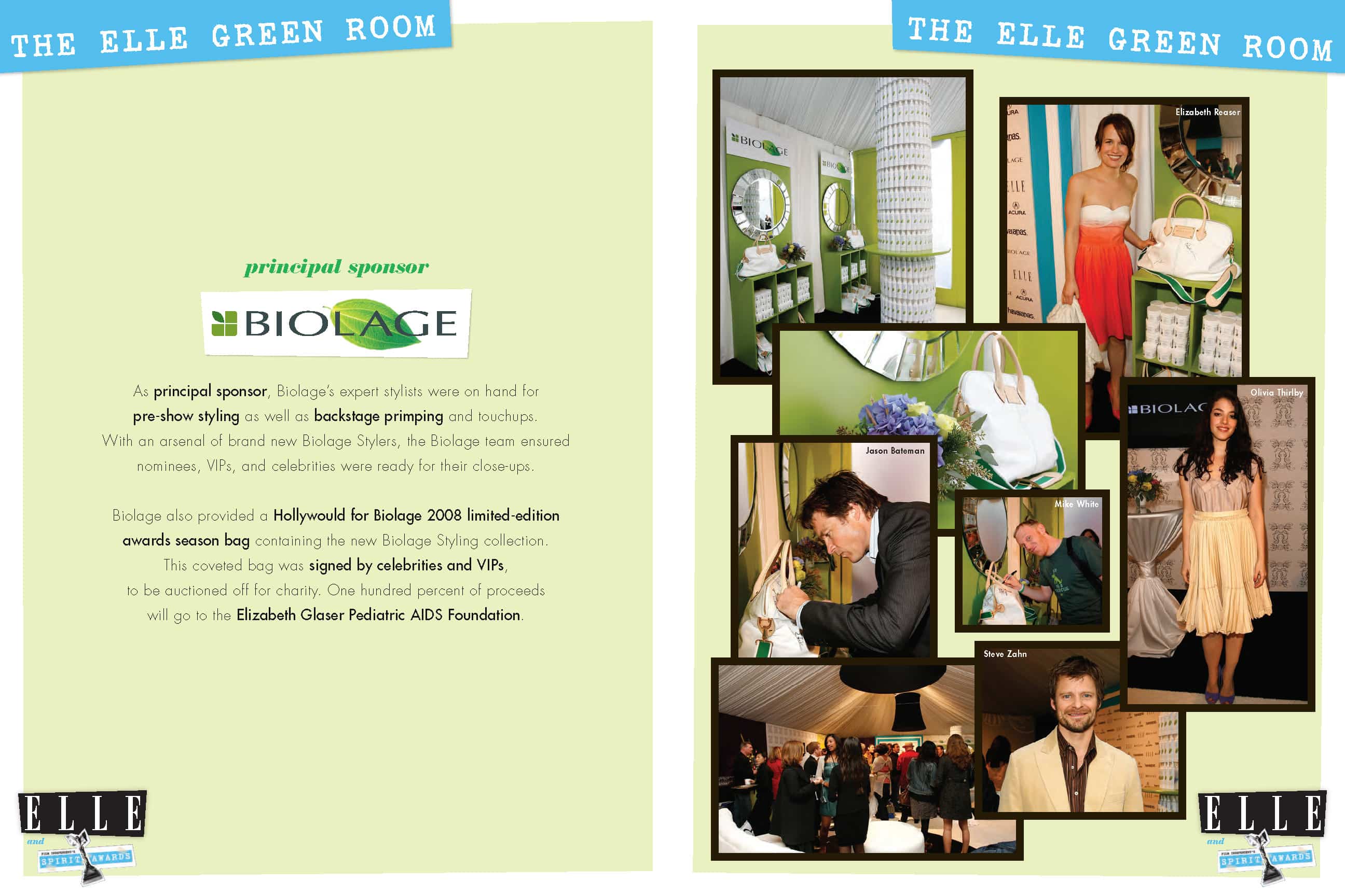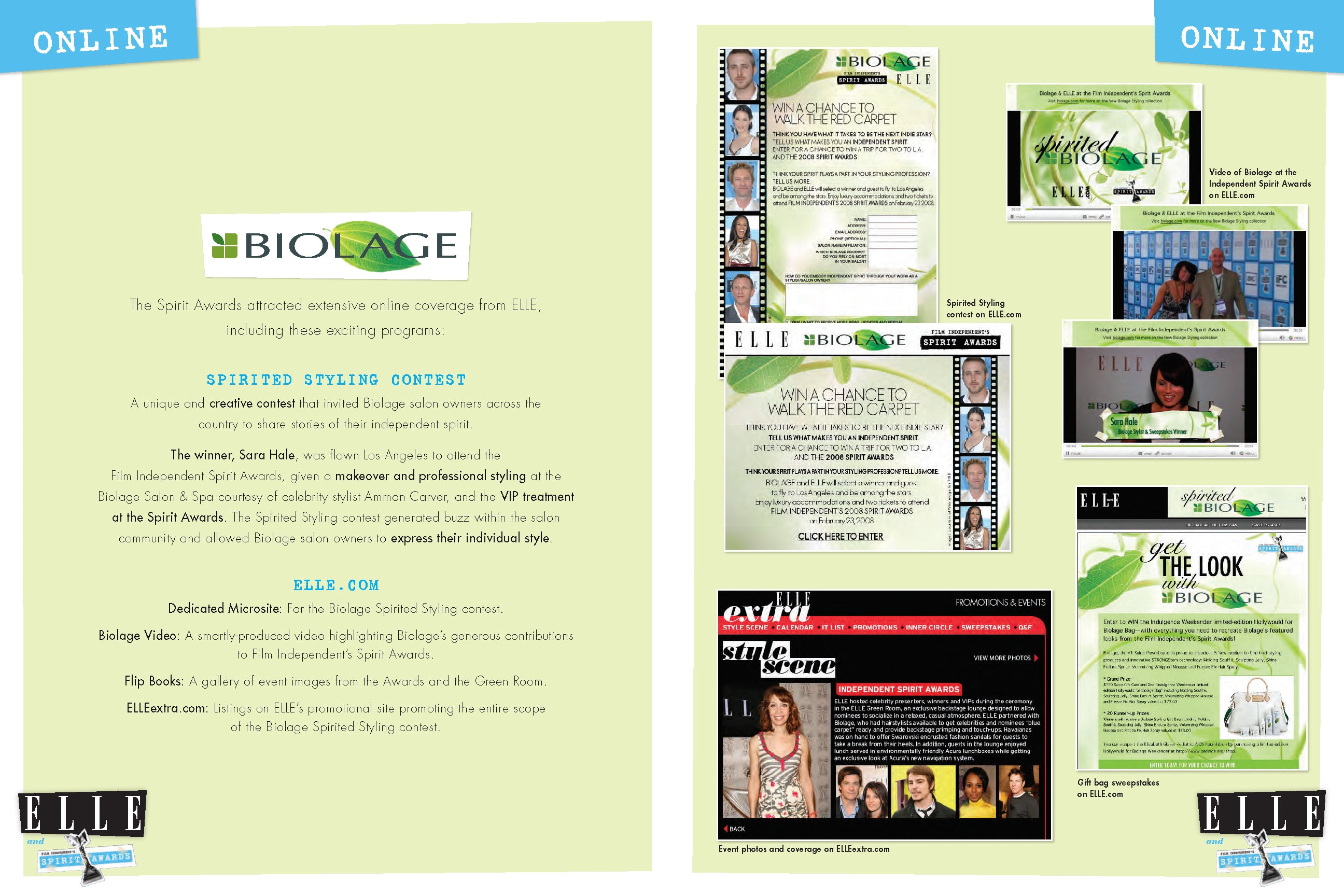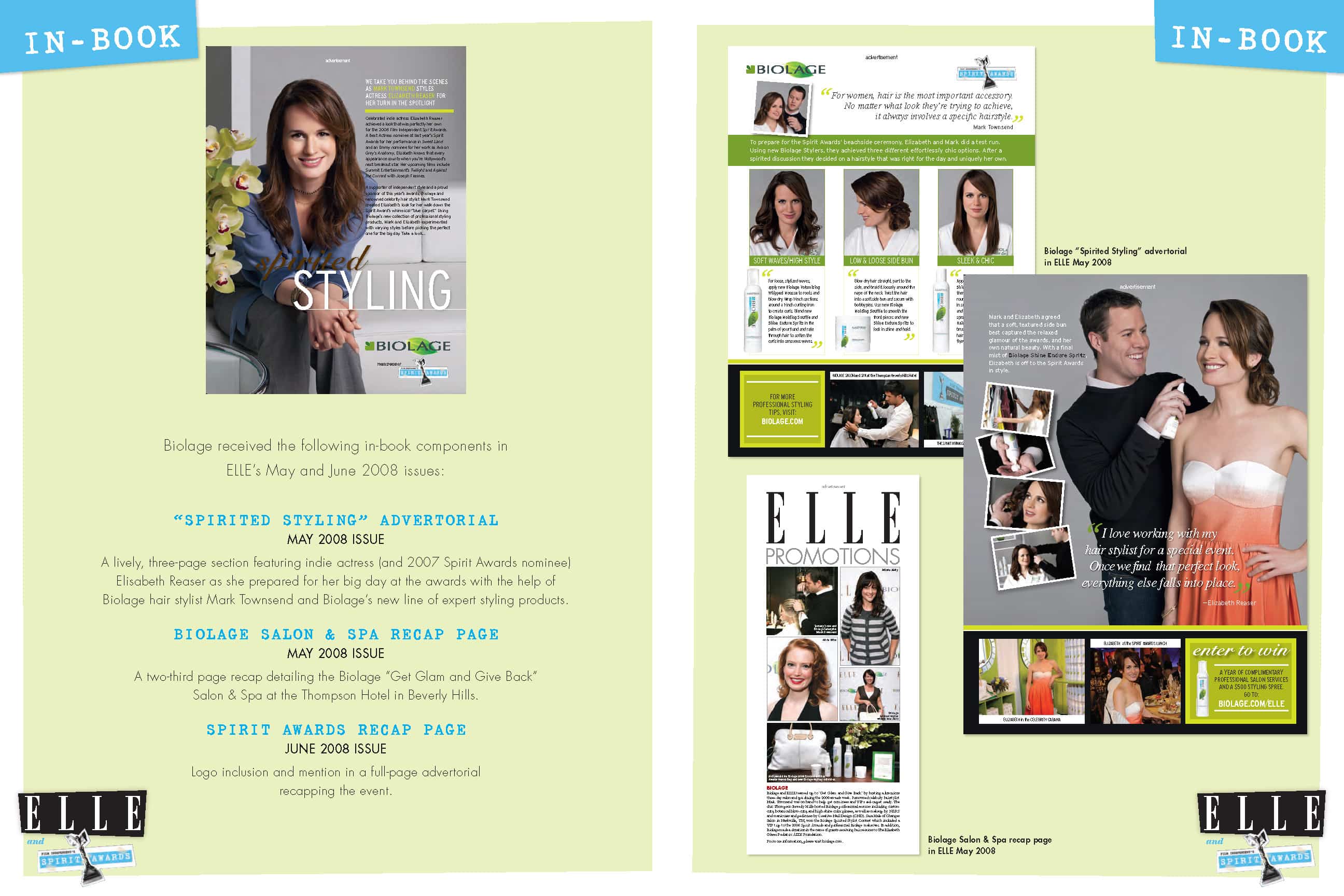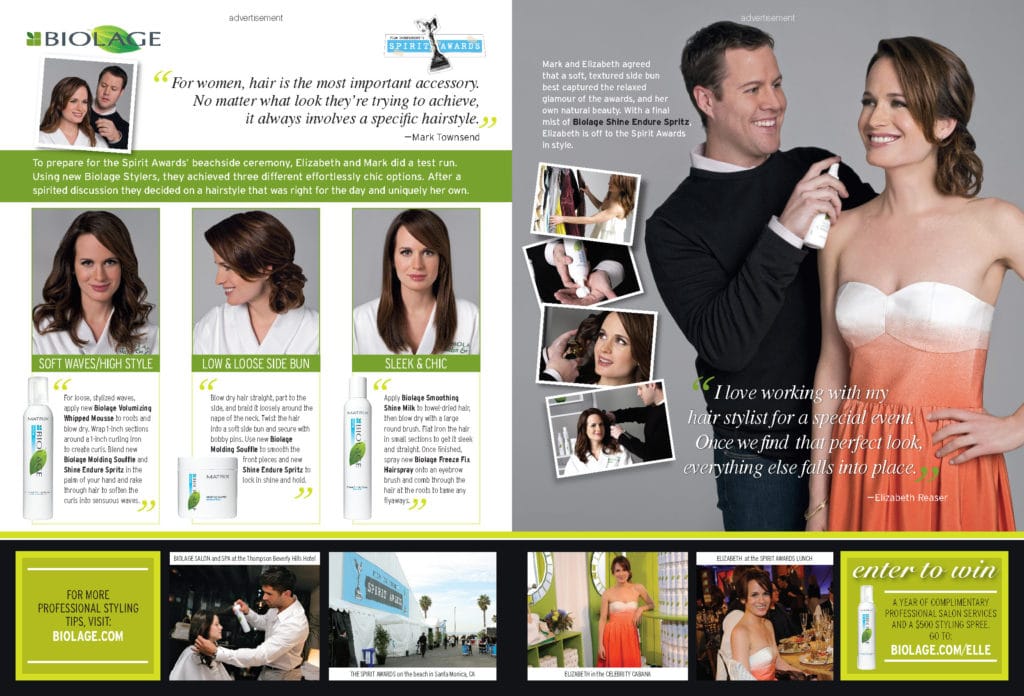 Custom content was created for ELLE magazine to promote the Biolage line of styling products and its sponsorship of Film Independent’s Spirit Awards. The multi-page unit showcased actress Elizabeth Reaser working with celebrity stylist Mark Townsend to get ready for the red carpet at the Spirit Awards. The unit also included shots of Elizabeth Reaser at the Spirit Awards and the pop-up Biolage Salon and Spa in Beverly Hills. The integrated marketing program for Biolage also included a Matrix styling contest, a Biolage Salon and Spa during Awards Week 2008, a Biolage activation in the ELLE green room at the Spirit Awards, and a dedicated microsite on ELLE.com—all featured in the program recap book below.