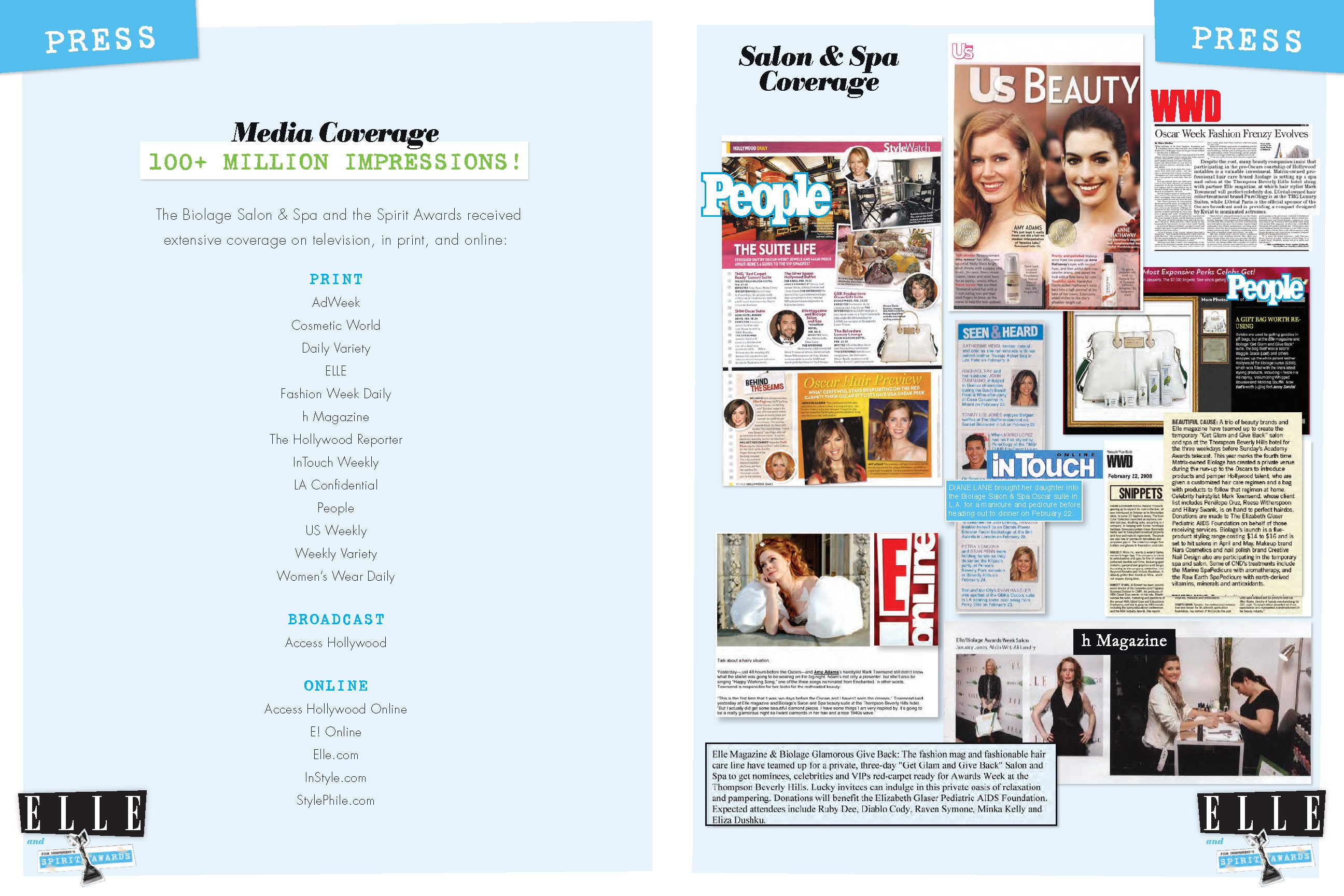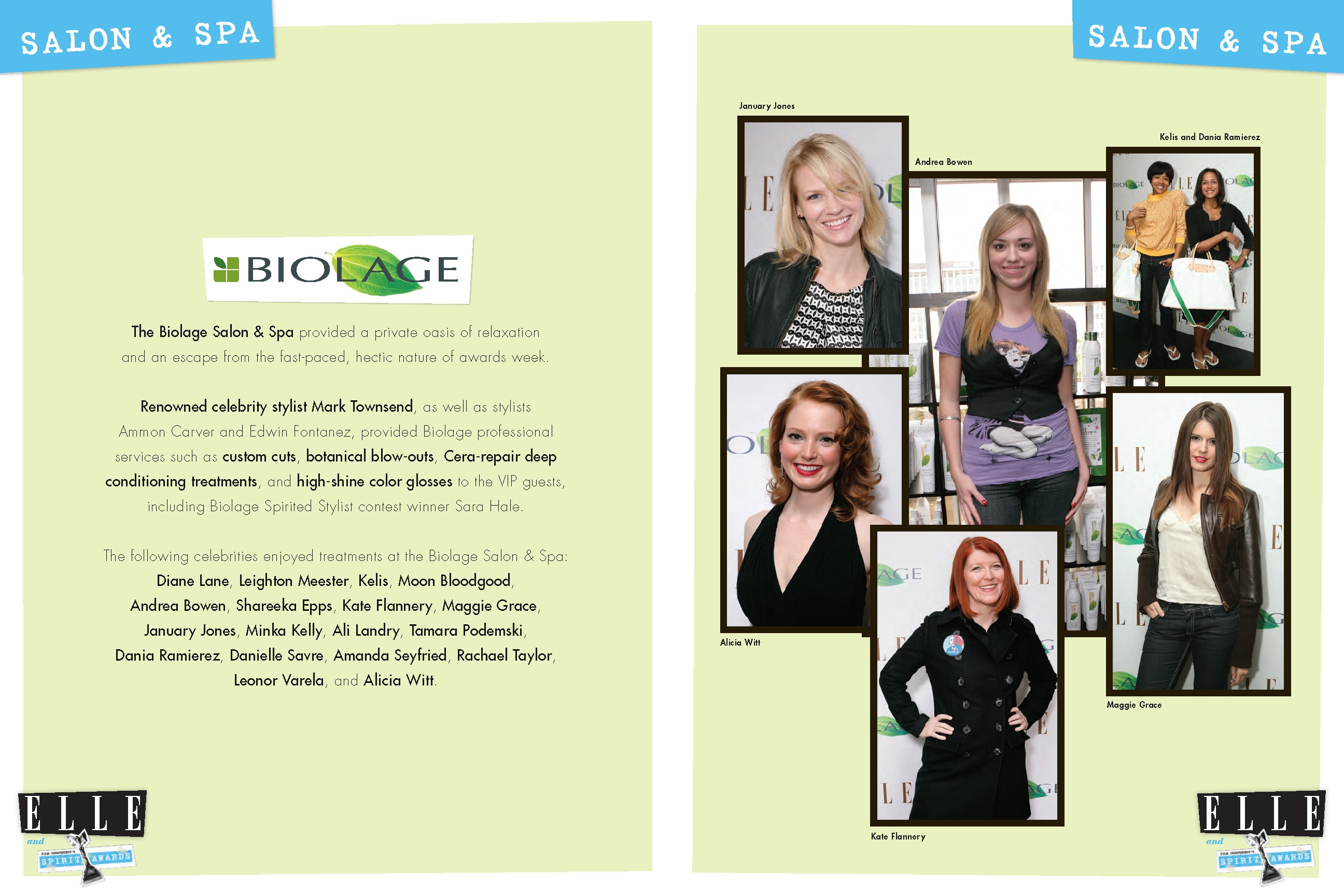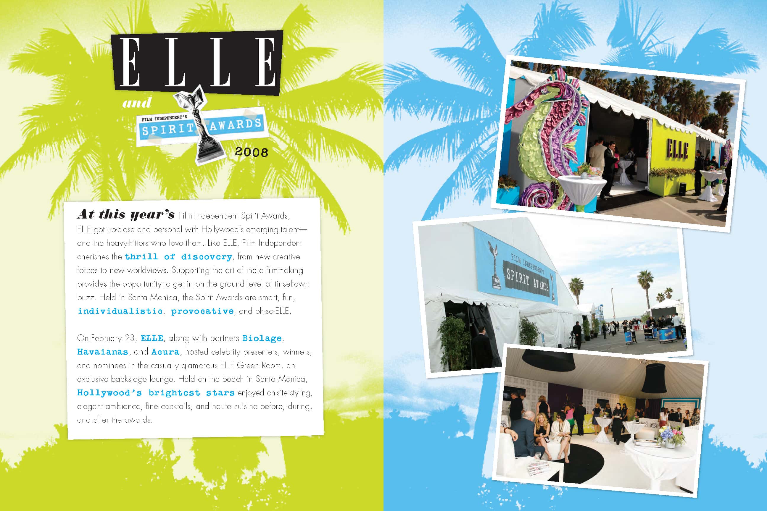 Custom content was created for ELLE magazine to promote the Biolage line of styling products and its sponsorship of Film Independent’s Spirit Awards. The multi-page unit showcased actress Elizabeth Reaser working with celebrity stylist Mark Townsend to get ready for the red carpet at the Spirit Awards. The unit also included shots of Elizabeth Reaser at the Spirit Awards and the pop-up Biolage Salon and Spa in Beverly Hills. The integrated marketing program for Biolage also included a Matrix styling contest, a Biolage Salon and Spa during Awards Week 2008, a Biolage activation in the ELLE green room at the Spirit Awards, and a dedicated microsite on ELLE.com—all featured in the program recap book below.