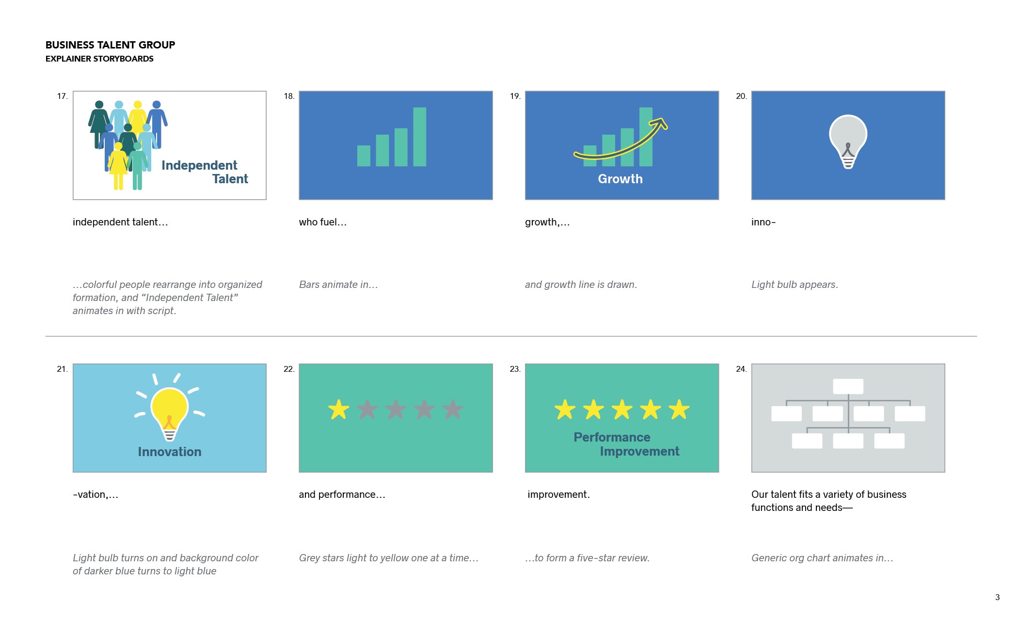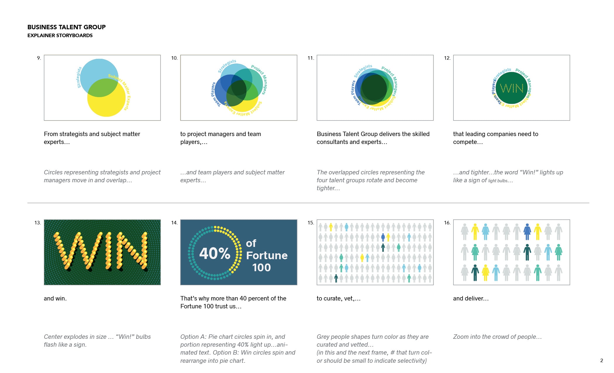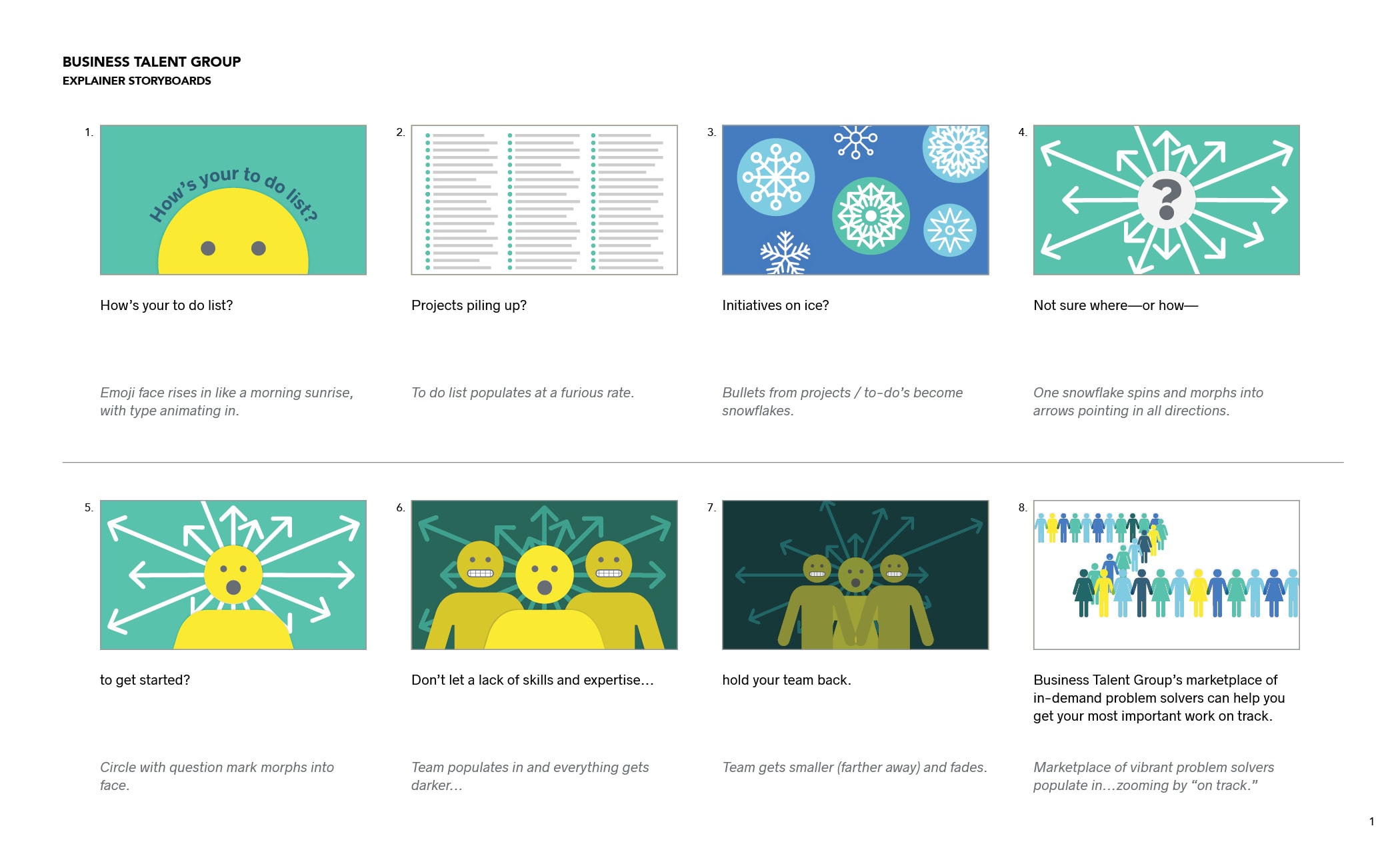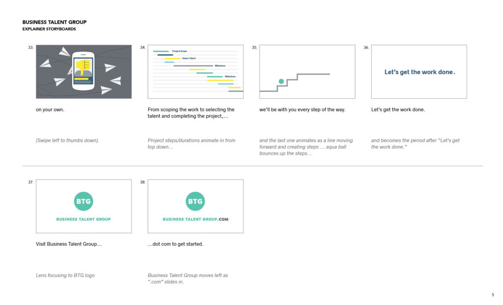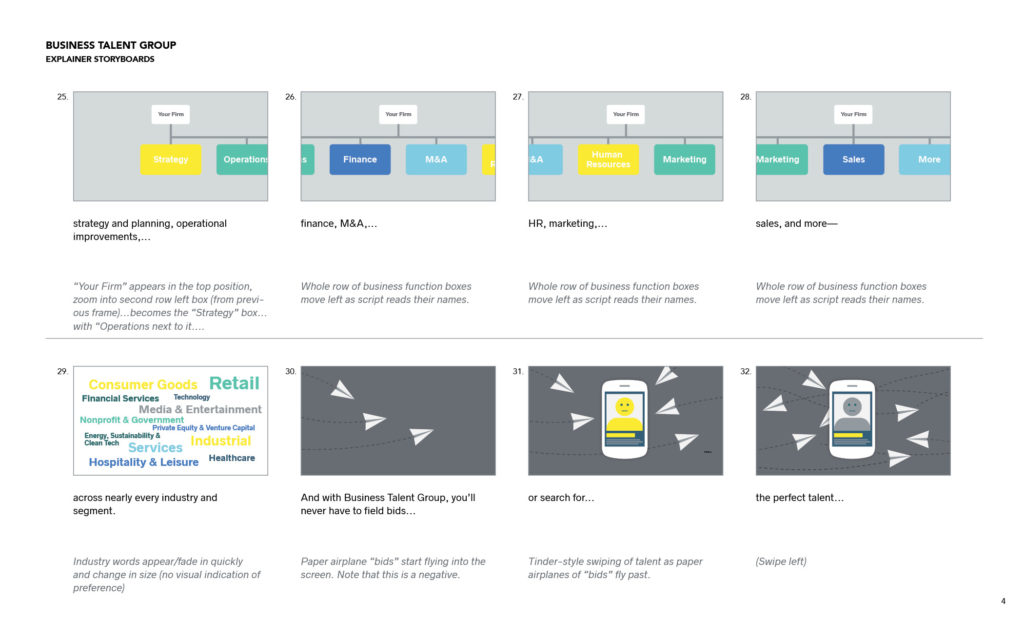 Business Talent Group (BTG) is the leader is placing high-end, on-demand talent and boasts a client list that includes 43% of Fortune 100 companies. BTG needed a pair of short videos—one to help recruit top performers into their talent pool, and another to launch their enterprise product. Each under two minutes, the videos were created for multi-platform use at events and trade shows, on the firm’s website, across social media, and in presentations. I first worked with BTG’s internal marketing team translate script drafts into final copy, storyboards, and illustrations, and then partnered with the wonderful team at HQ Creative to animate bring storyboards to life.